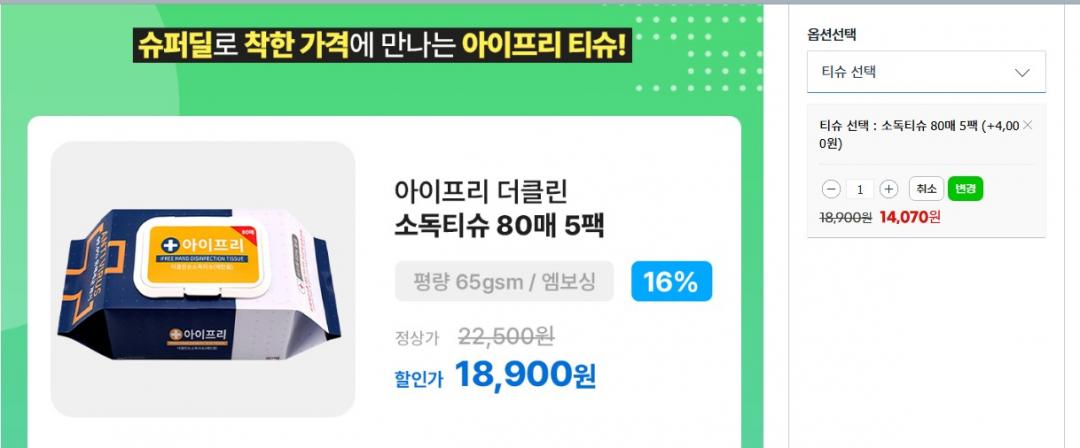 [지마켓] 아이프리 더클린 소독티슈 80매 5팩 (14,070원/무배)