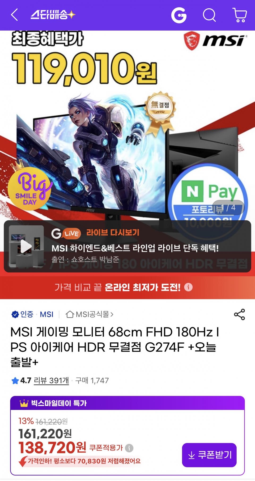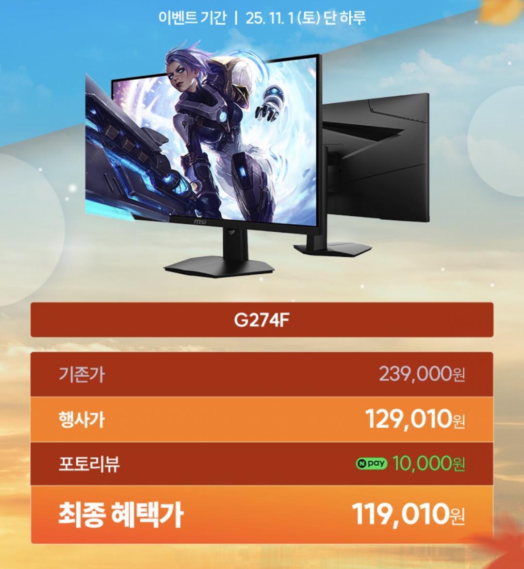 [G마켓] MSI G274F IPS 게이밍 180 아이케어 HDR 무결점 (129,010/무배) > 국내핫딜