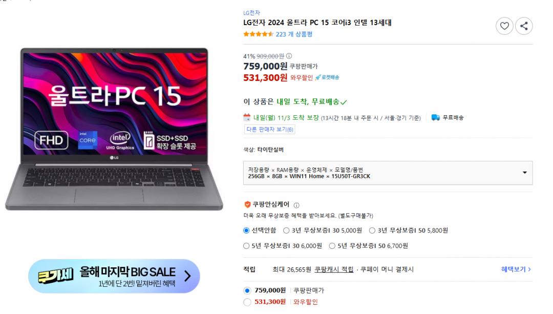 [쿠팡] LG전자 2024 울트라 PC 15 (531,300/무)
