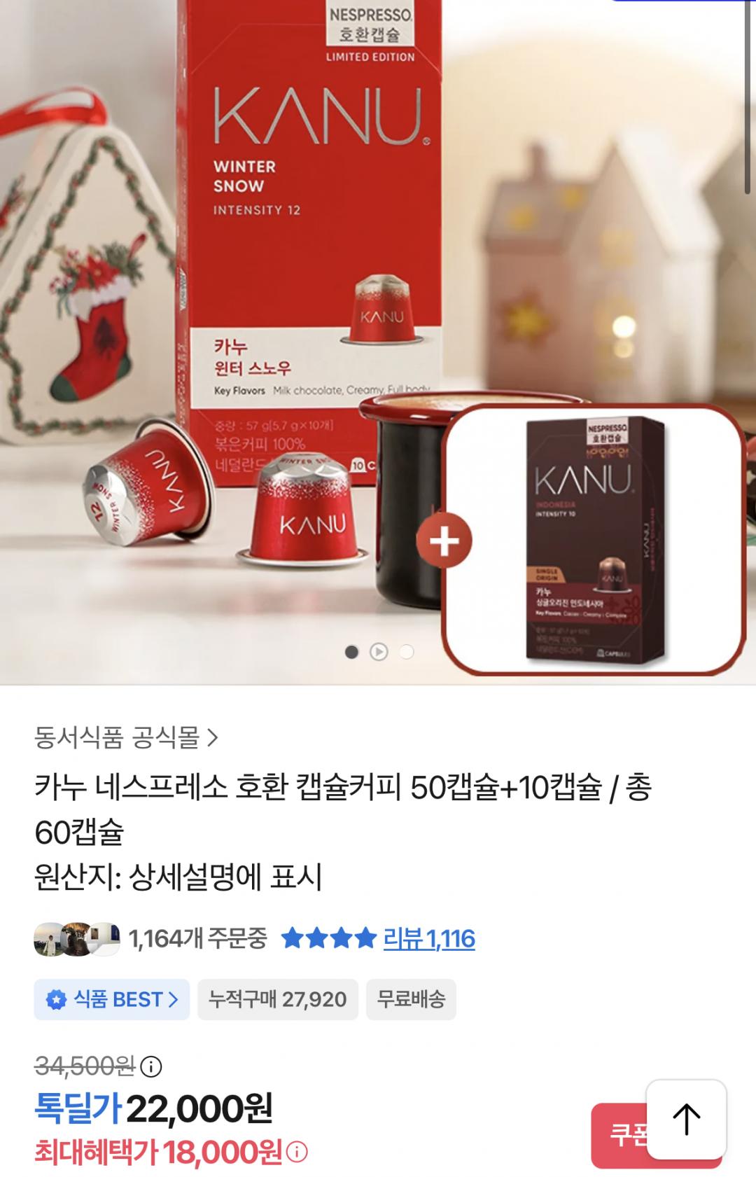 [톡딜] 카누 네스프레소 호환 캡슐커피 60캡슐 (18,000원/무료)