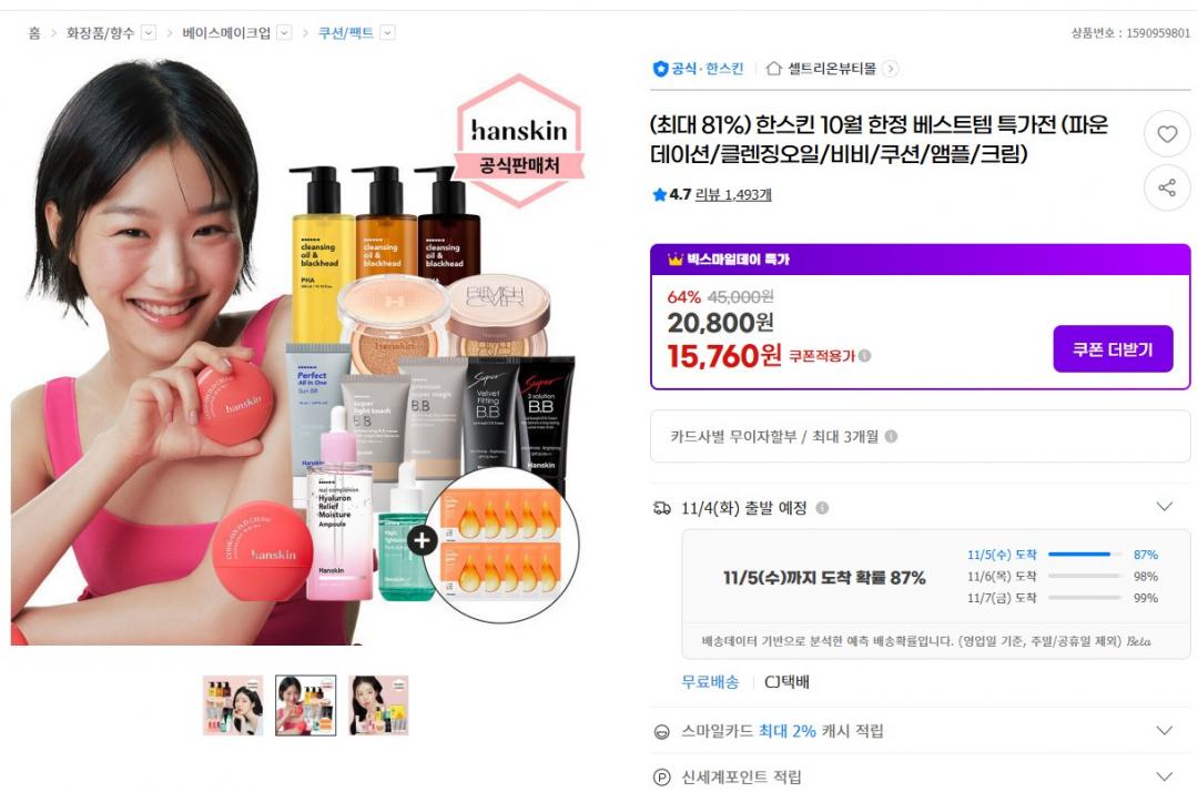[지마켓] 한스킨 10월 한정 베스트템 특가전 (파운데이션/클렌징오일/비비/쿠션/앰플/크림) (15,760원 가격 다양/무배) > 국내핫딜