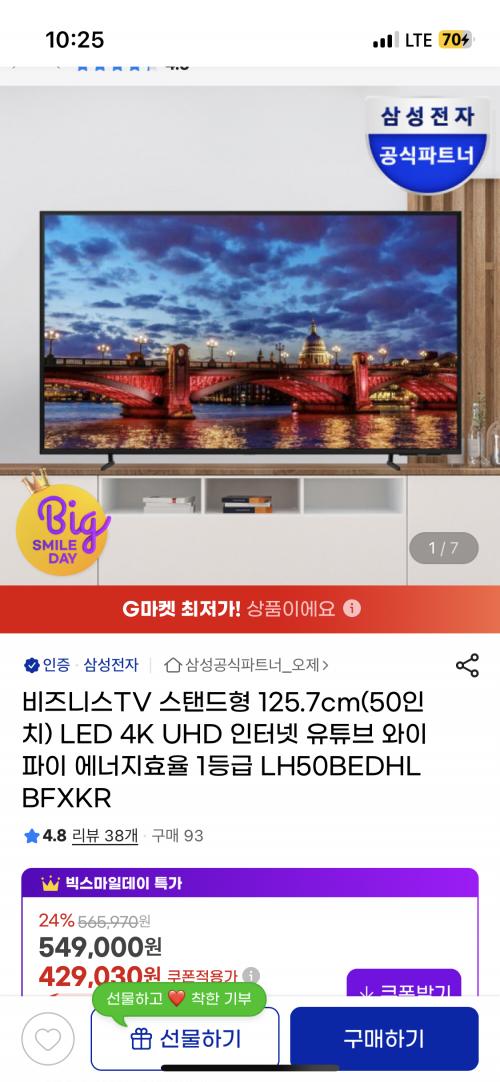 [지마켓] 삼성 비즈니스TV 스탠드형 125.7cm(50인치) LED 4K UHD 인터넷 유튜브 와이파이 에너지효율 1등급 LH50BEDHLBFXKR(399,000원/무료)