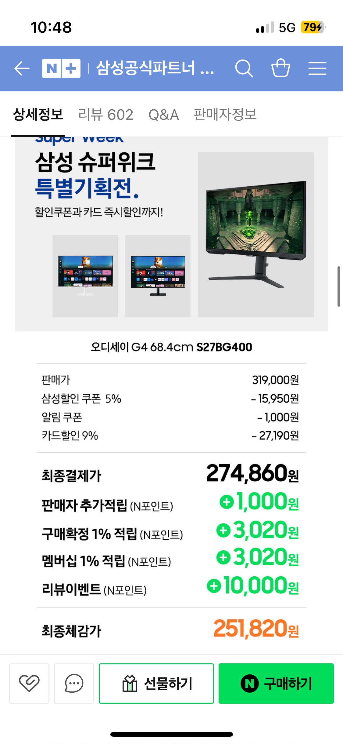 [네이버] 삼성 오디세이 G4 LS27BG400 68.4cm 게이밍 모니터 IPS 240Hz 1ms (251,820원/무료)