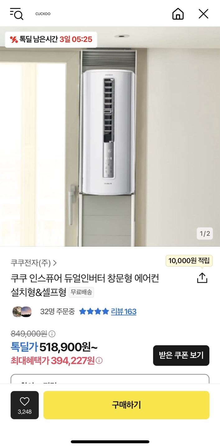[카카오톡딜] 쿠쿠 창문형에어컨 할인 (397,947원/무배)
