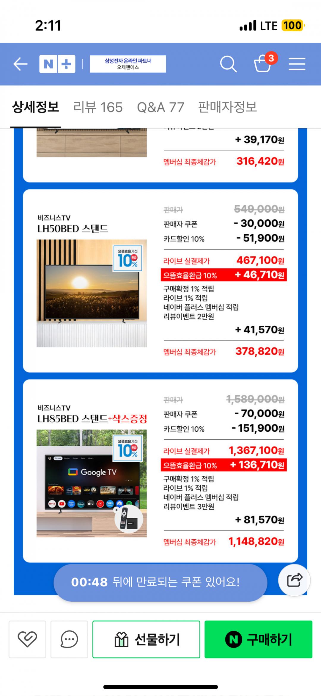 [네이버] 혜택가 122만 삼성 214.7cm(85인치) UHD 4K TV LH85BEDHLGFXKR 1등급 스탠드 (1,148,820원/무료)