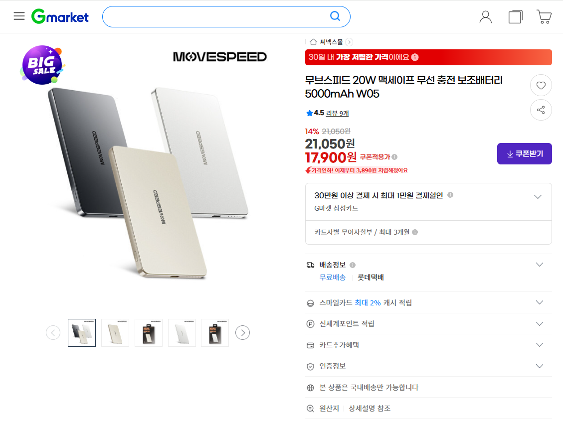 [지마켓] 무브스피드 20W 맥세이프 무선 충전 보조배터리 5000mAh (17,900원/무료)