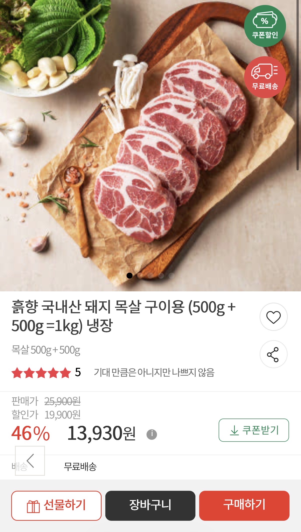 [우체국] 국내산 목살 1kg (13,930원/무료배송)