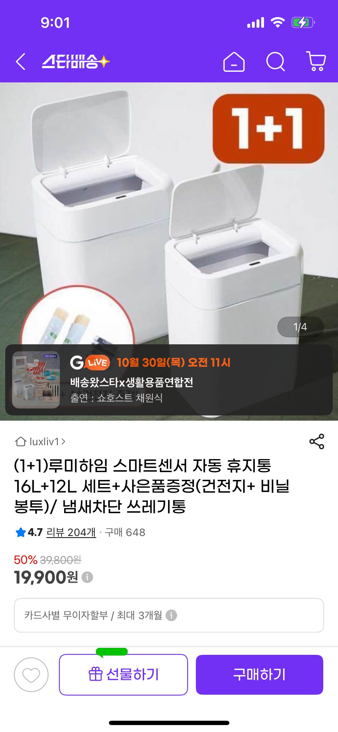 [G마켓] 스마트센서 자동 휴지통 16L+12L 세트(19,900/무료)