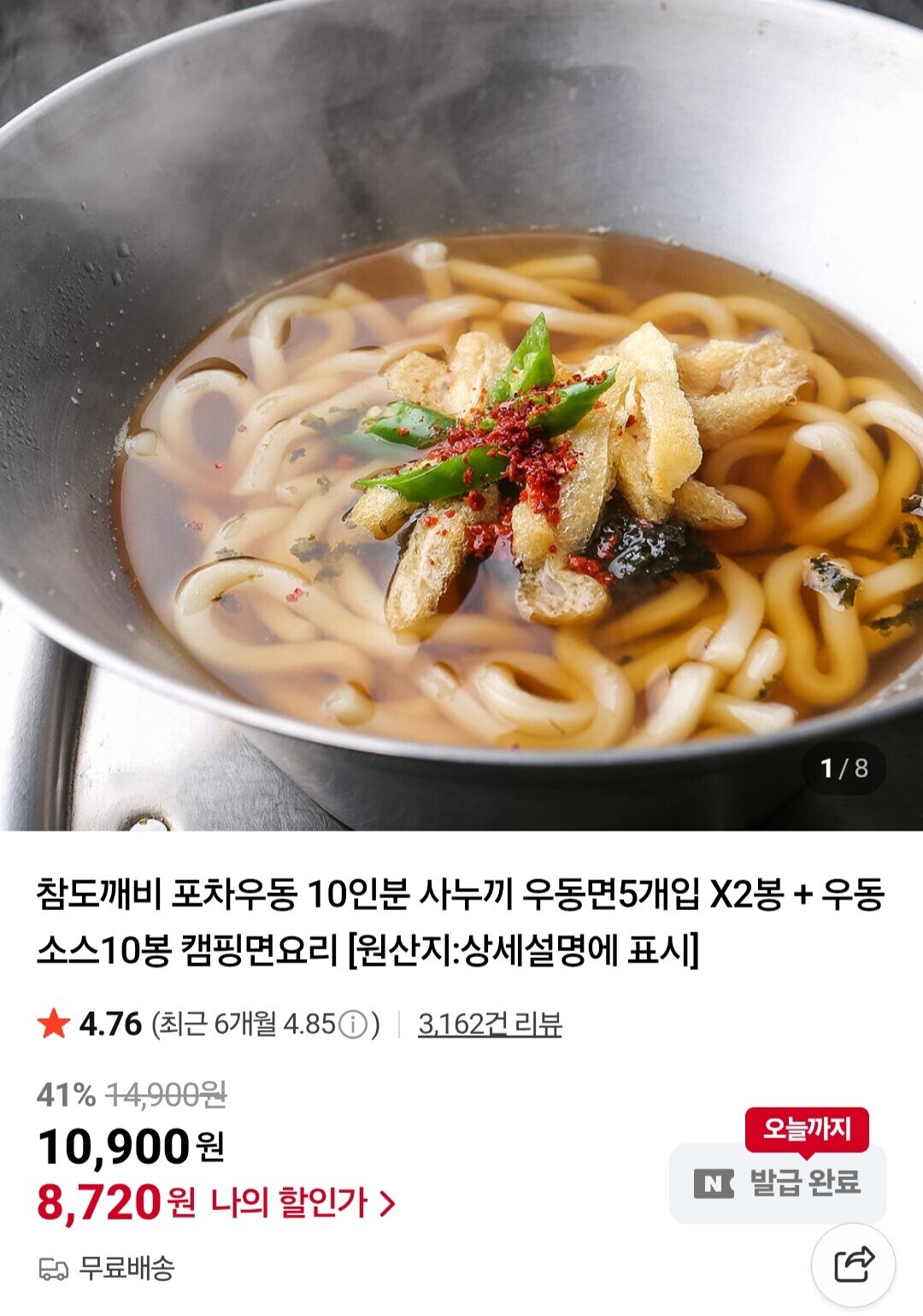 [네이버] 포차우동 10인분 사누끼 우동면5개입 X2봉 + 우동소스10봉 (8,720원/무료)