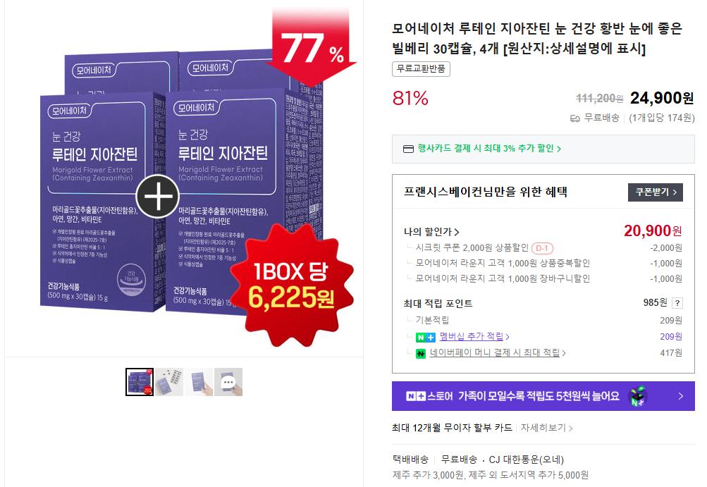 [네이버]루테인 지아잔틴 30캡슐×4박스 (20,900원/무료배송)