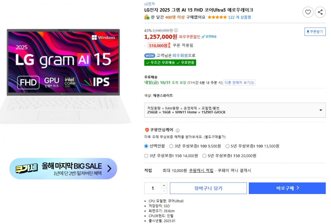 [쿠팡] 엘지 그램 15Z90T-GA5CK (와우1,257,000원/무료)