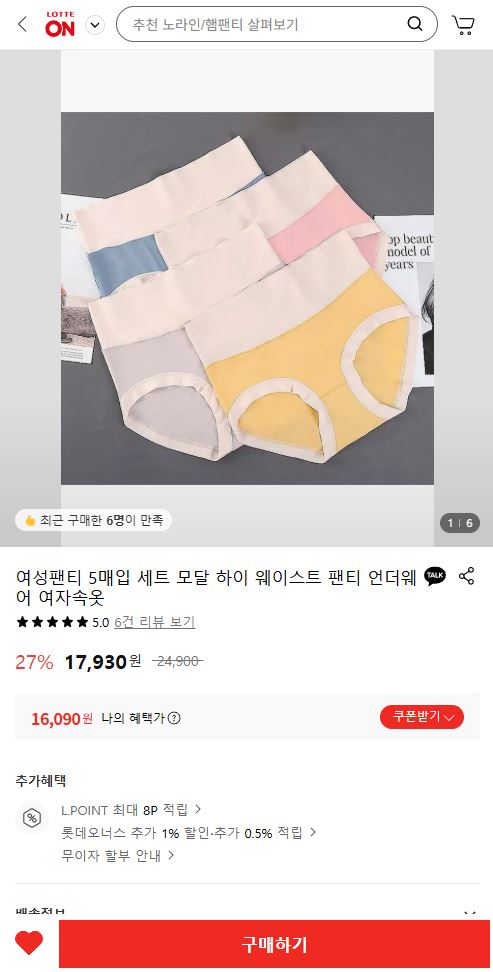 [롯데온] 뱃살 잡아주는 여자 모달 하이웨이스트 팬티 핫딜 5매입세트 (16,090/무료)