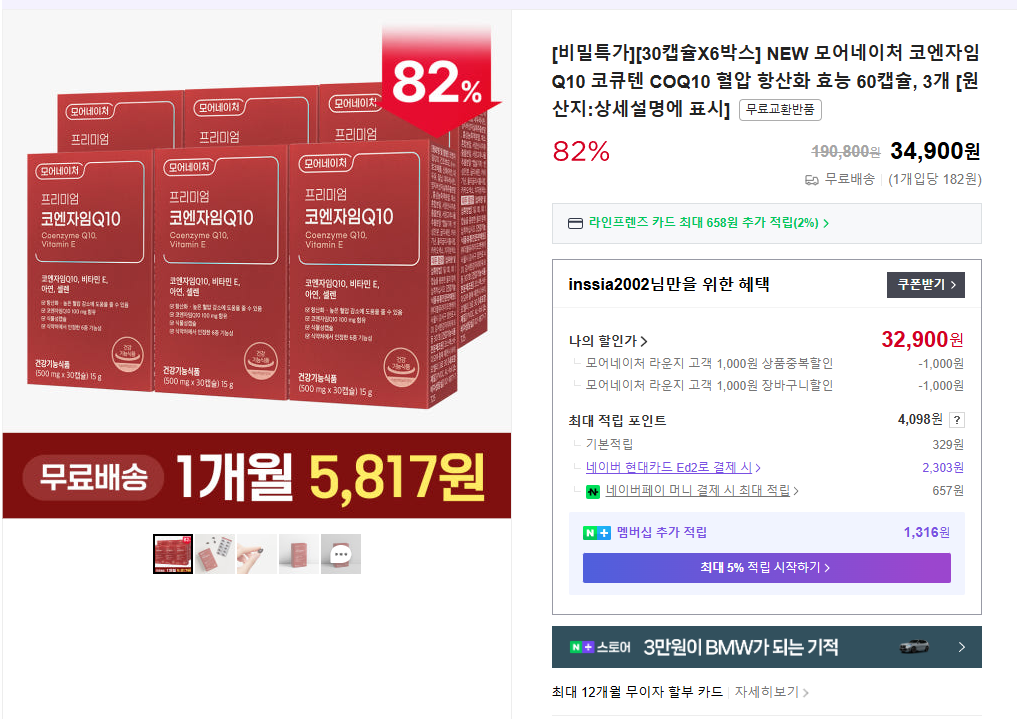[네이버] 코엔자임 Q10 30캡슐×6박스 (34,900원/무료배송)