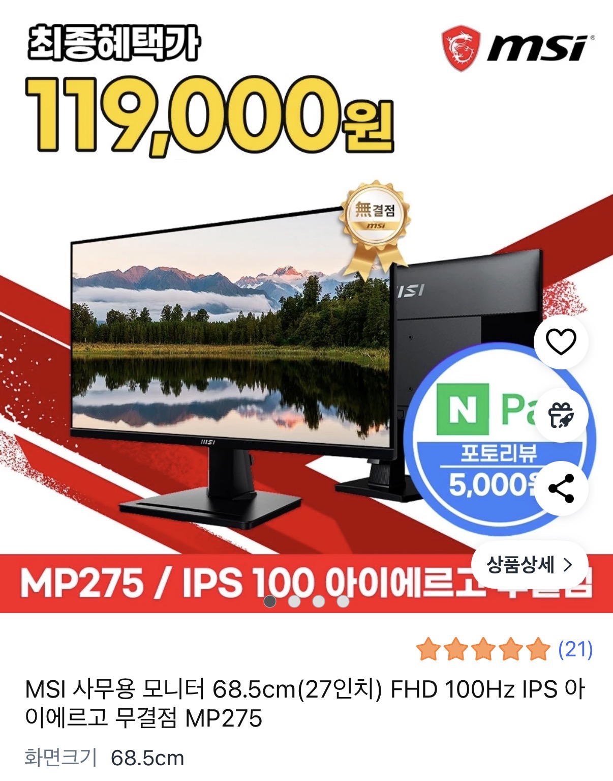 [쿠팡] MSI MP275 IPS 100 아이에르고 무결점 (124,000원/무배)