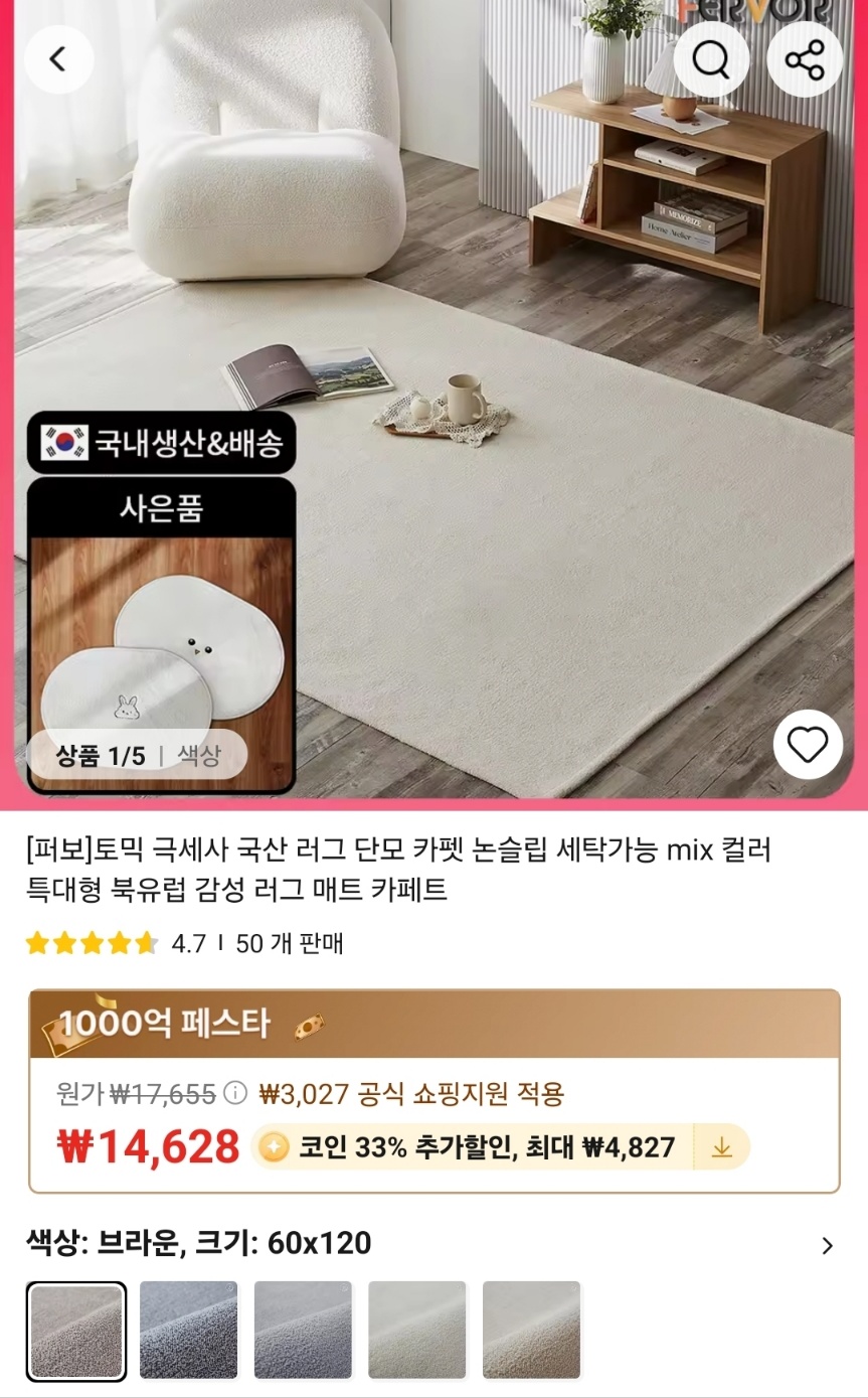[알리] 국내산 러그,카페트 + 발매트 (9,801원/무료)