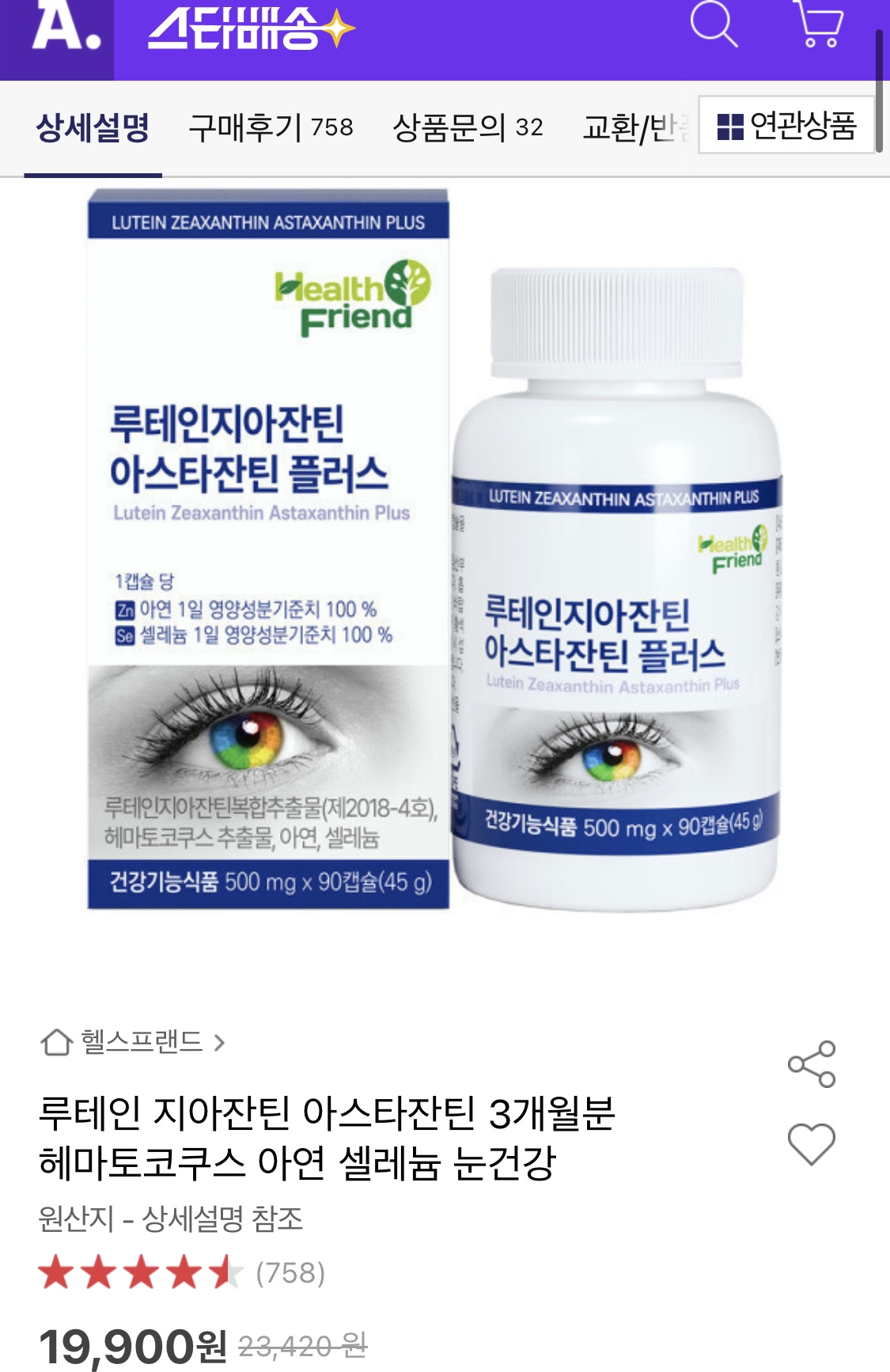 [옥션] 루테인 지아잔틴 아스타잔틴 3개월분 (19,900원/무료)
