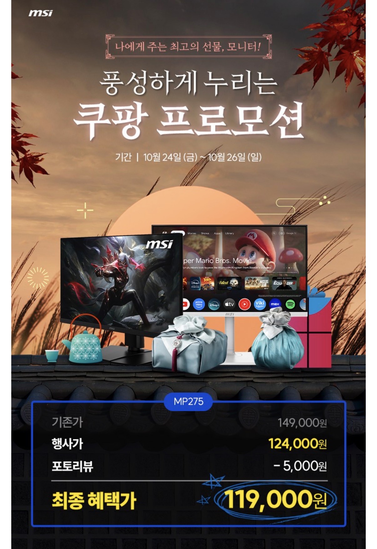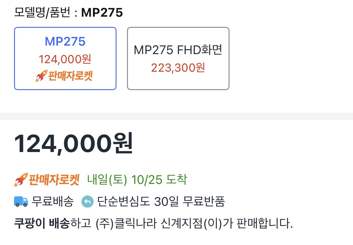 [쿠팡] MSI MP275 IPS 100 아이에르고 무결점 (124,000원/무배)