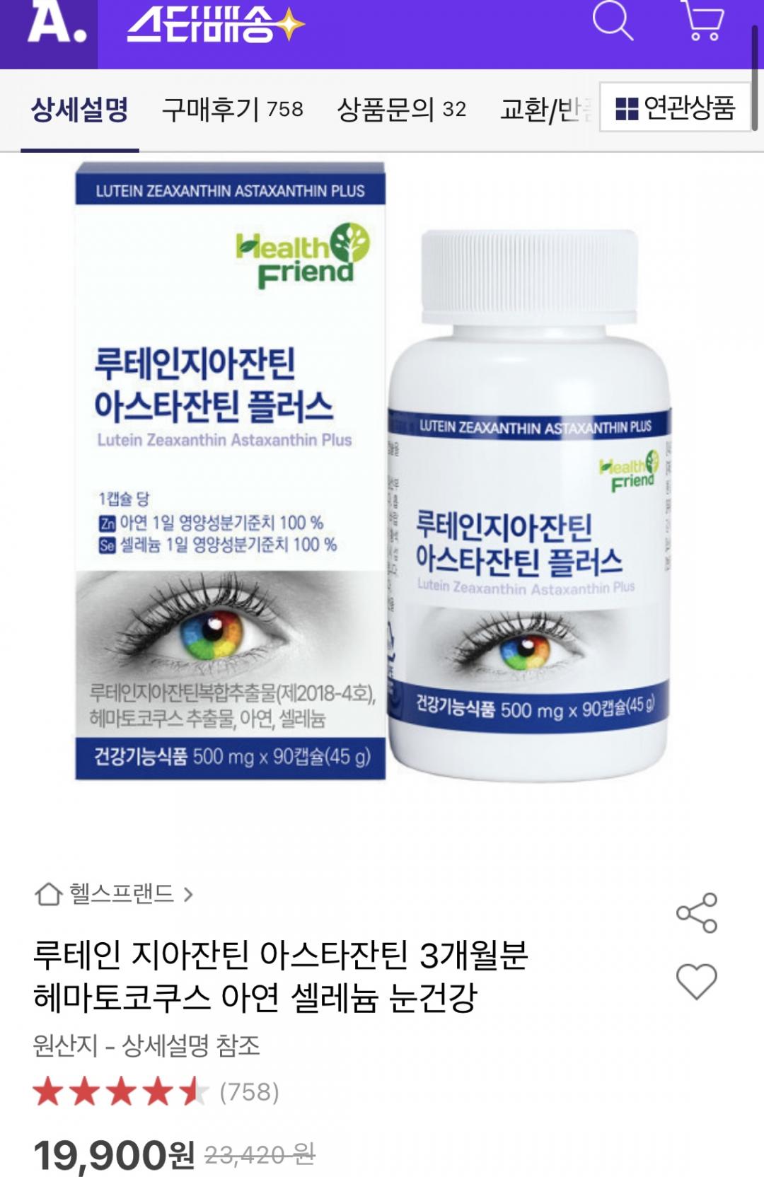 [옥션] 루테인 지아잔틴 아스타잔틴 3개월분 (19,900원/무료)