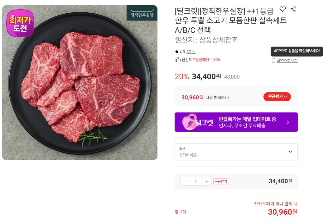 롯데온) 정직한우실장 한우 투뿔 소고기 실속세트 30,960원/무배 > 국내핫딜