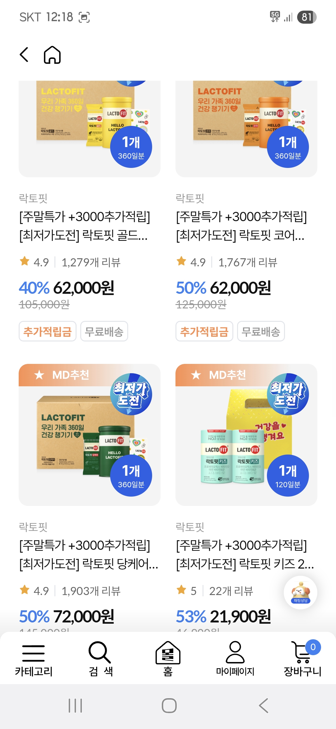 [종근당건강몰] 락토핏 골드/코어/당케어 360포 (체감59,000원/무료) > 국내핫딜
