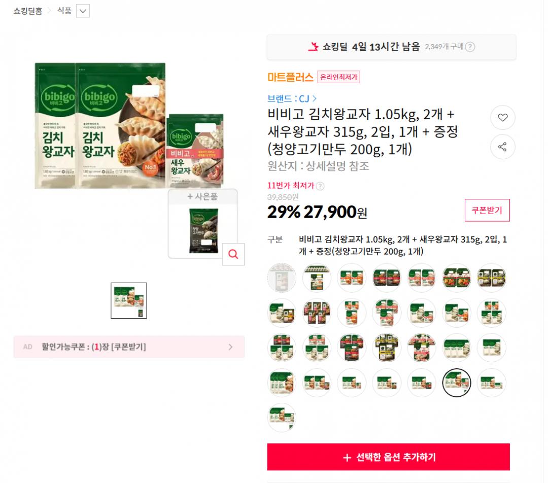 [11번가] 비비고 김치왕교자 1.05kg 2개 + 새우왕교자 315g, 2입 1개 + 증정(청양고기만두 200g, 1개) (27,900원 / 무료) > 국내핫딜