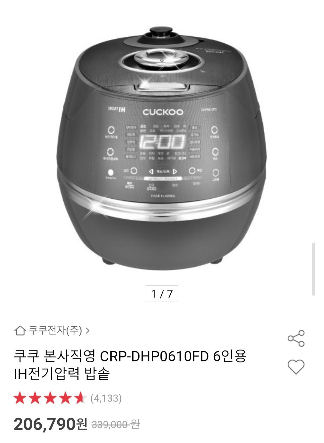 [옥션] 쿠쿠 IH전기압력밥솥 6인용 (192,320원/무료) > 국내핫딜