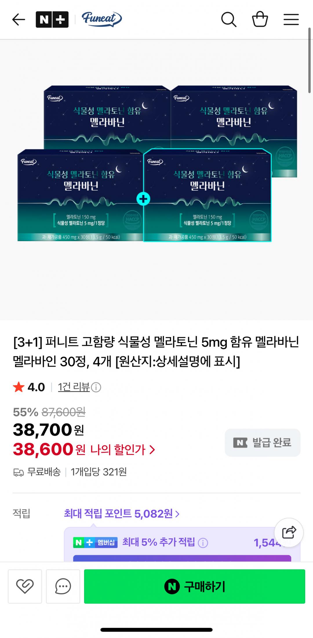 [네이버] 퍼니트 고함량 멜라토닌함유 멜라바닌 30정 4박스(38600원/무료)