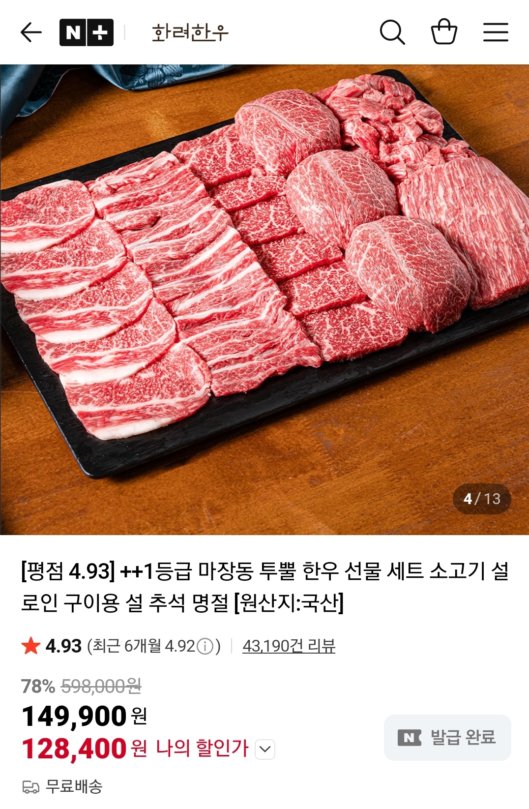 [네이버] 화려한우 1++ 한우 구이용 모듬 선물세트 (128,407원~/무료)