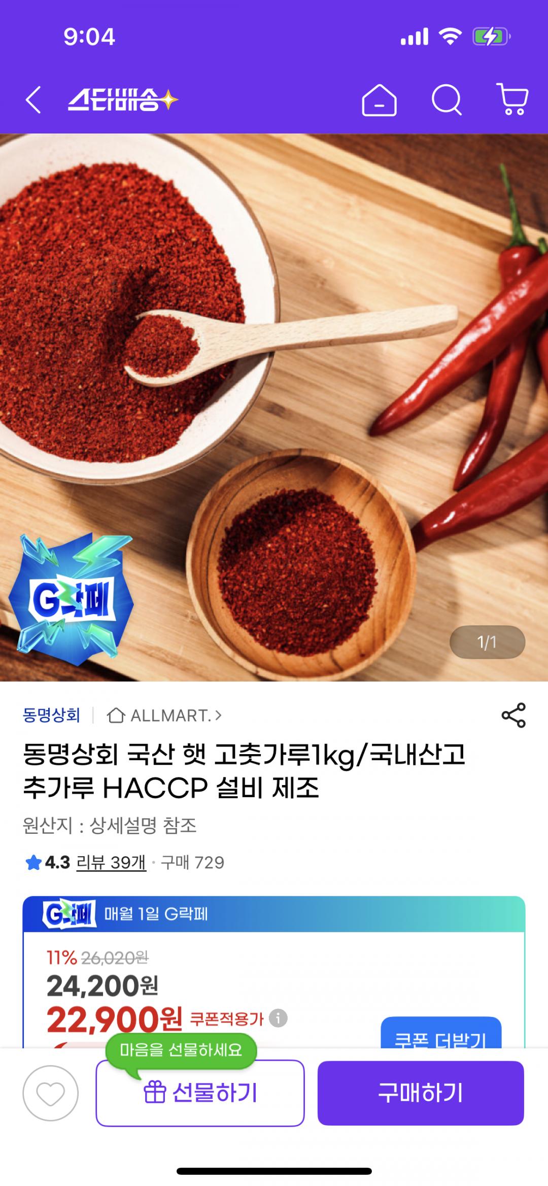 [지마켓] 국산 햇 고춧가루1kg (22,900원/무료)