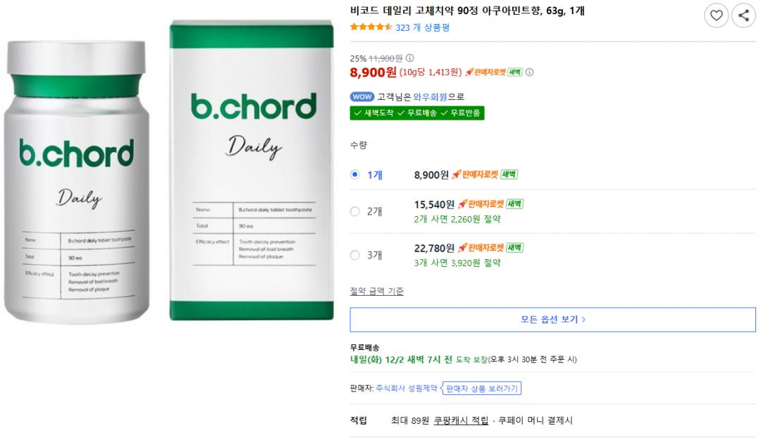 쿠팡)비코드 데일리 고체치약 63g 1개 8900원/무배