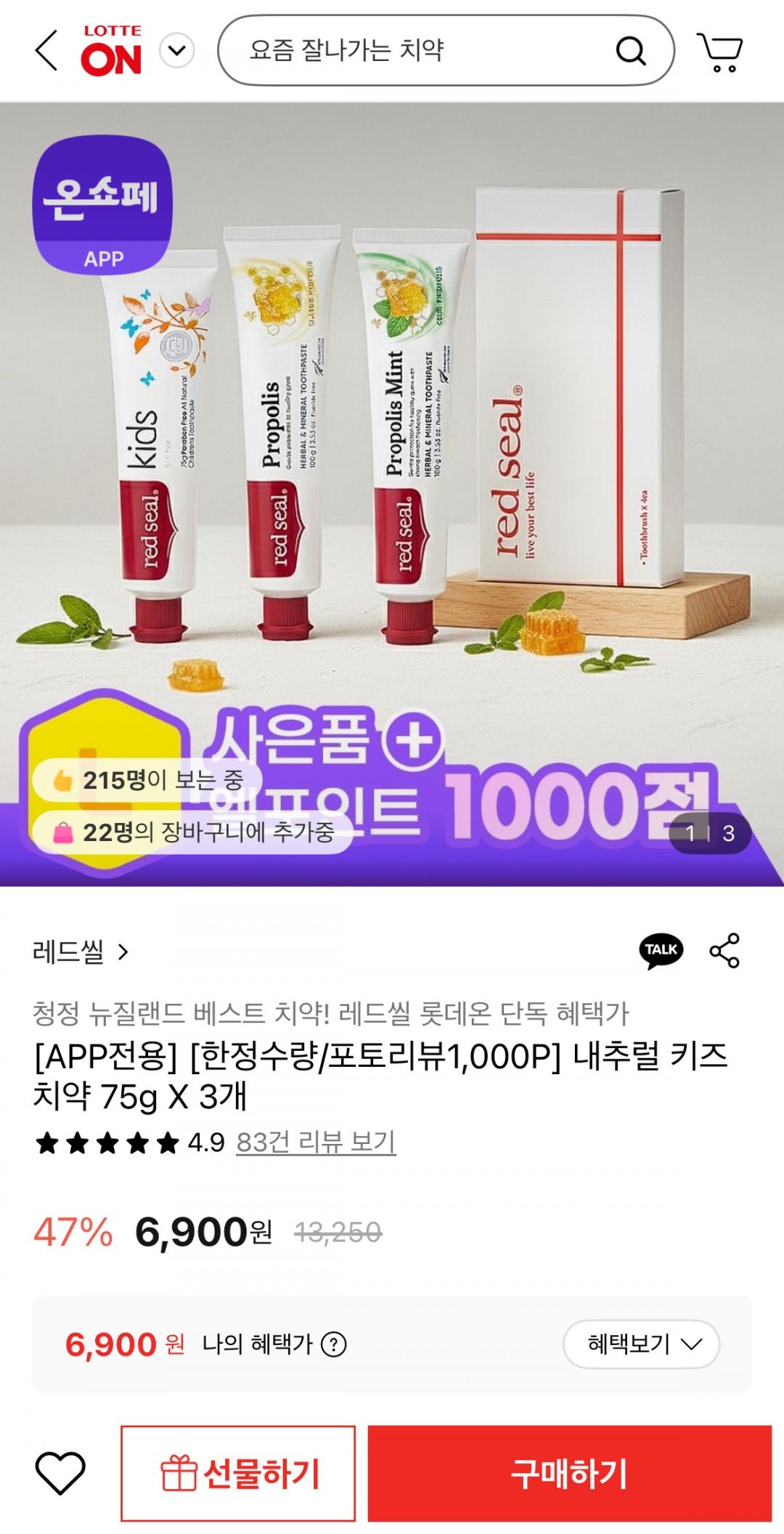 [롯데온] 레드씰 내추럴 키즈치약 75g 3개입+민트치약 2개 증정 (6,900원/무료)