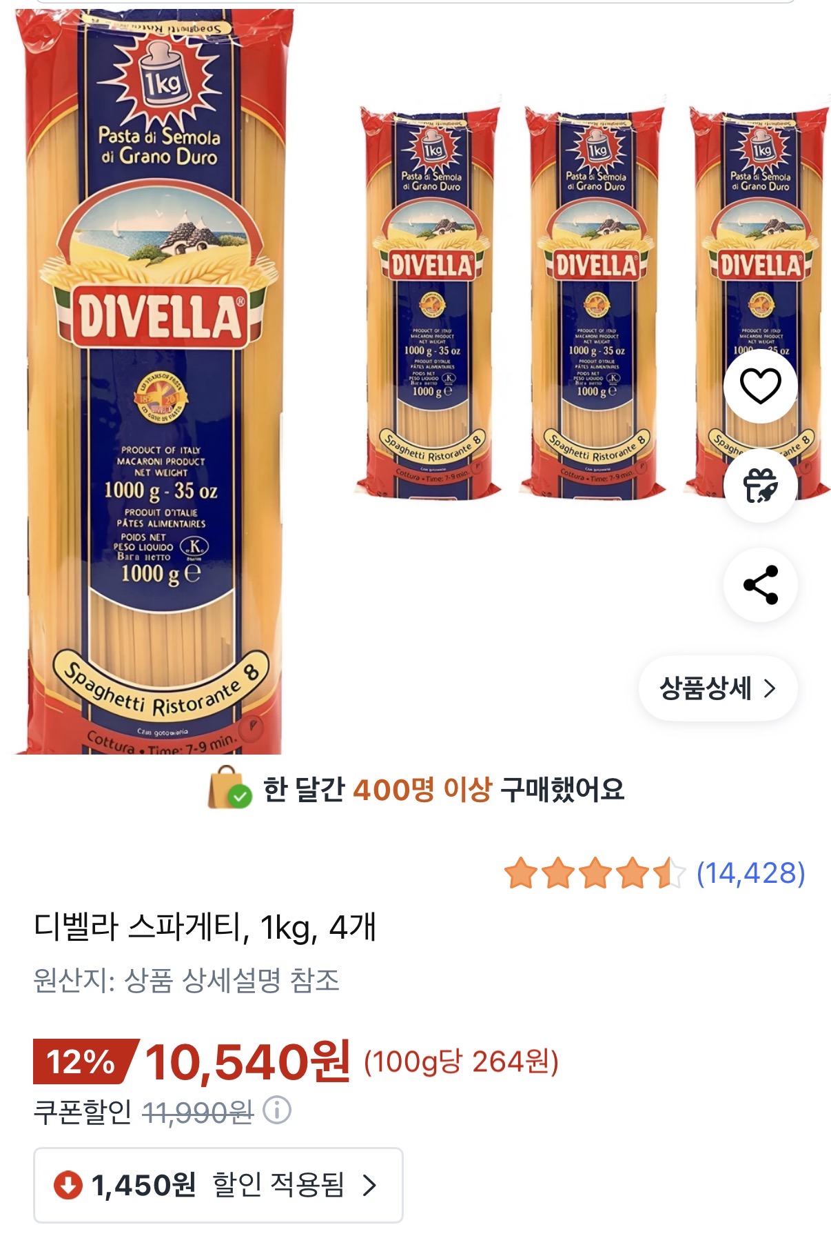 [쿠팡] 디벨라 스파게티1kg 4개 (10,540원/와우무료)