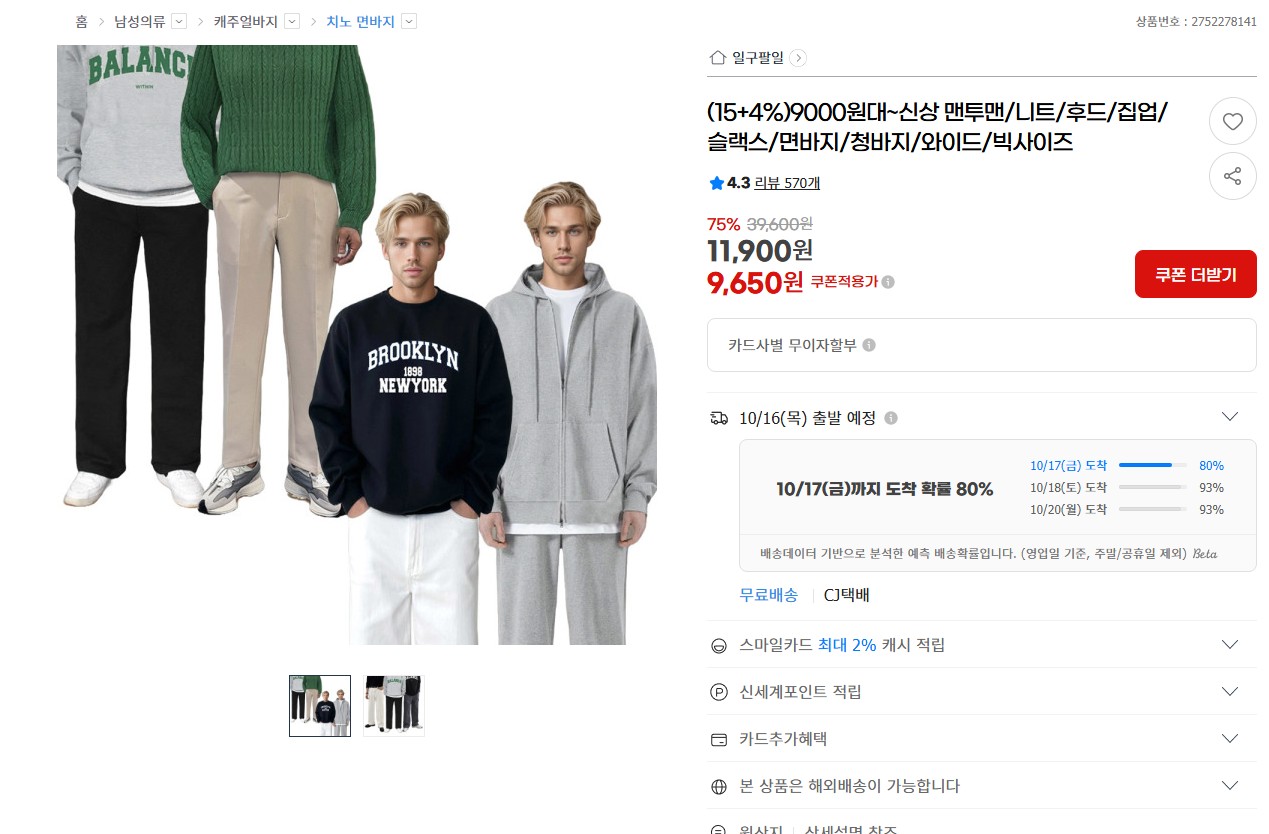 [지마켓] 신상 맨투맨/니트/후드/집업/슬랙스/면바지/청바지/와이드팬츠 등 (9,650원/무배) 댓글1개