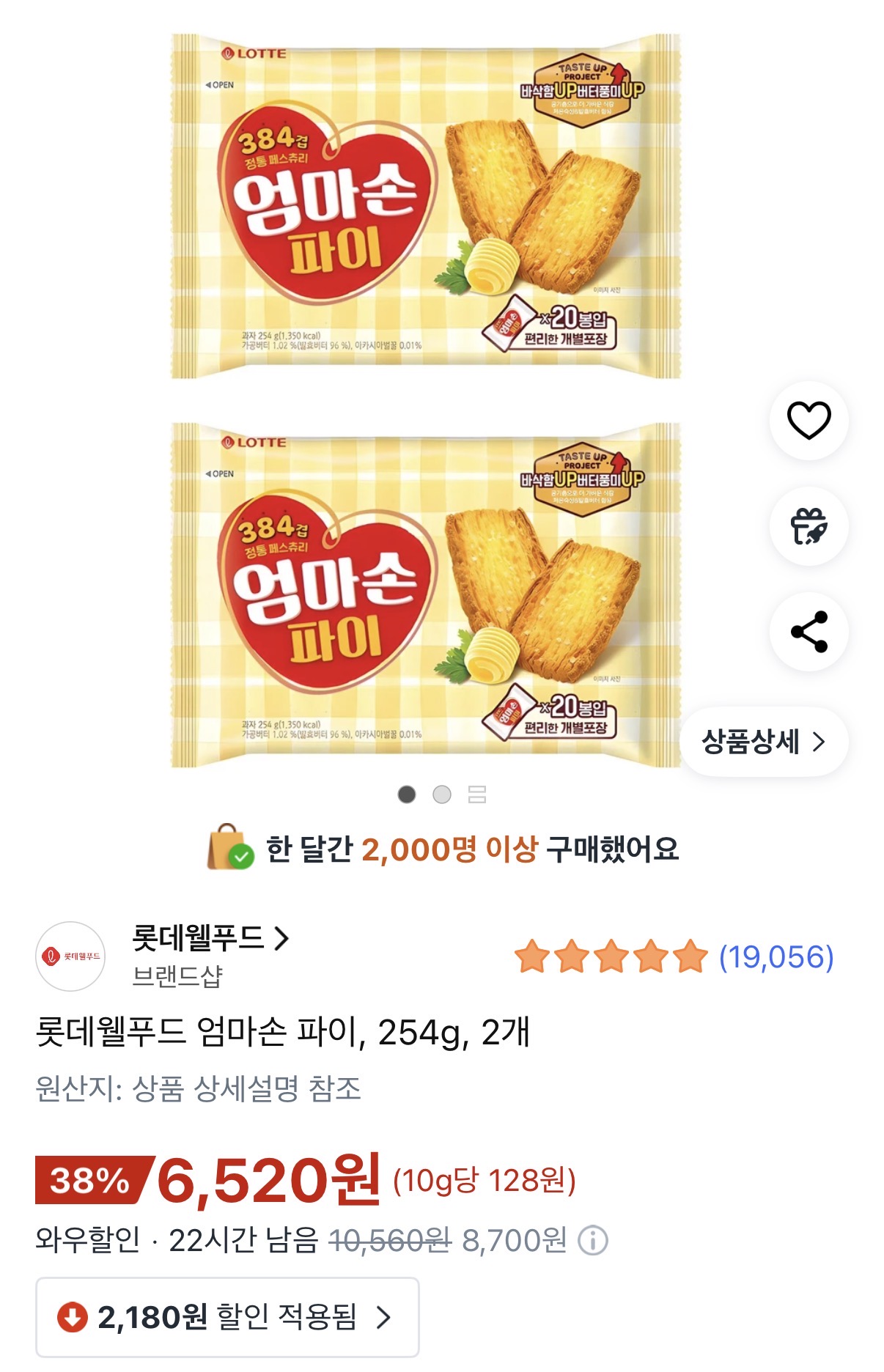 [쿠팡] 롯데웰푸드 엄마손 파이 254g 2개(와우6,520원/와우무료) 댓글1개