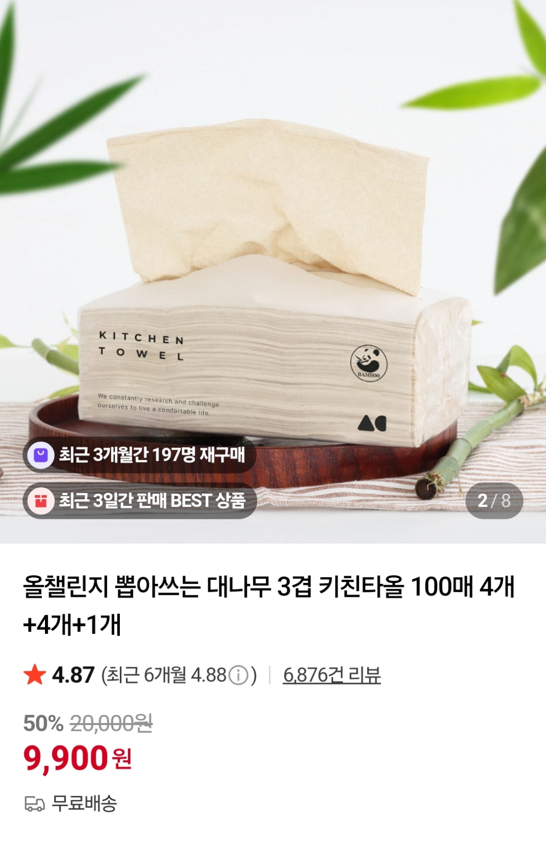 [네이버] 올챌린지 뽑아쓰는 대나무 3겹 키친타올 100매 9개 (9,900원 / 무료)