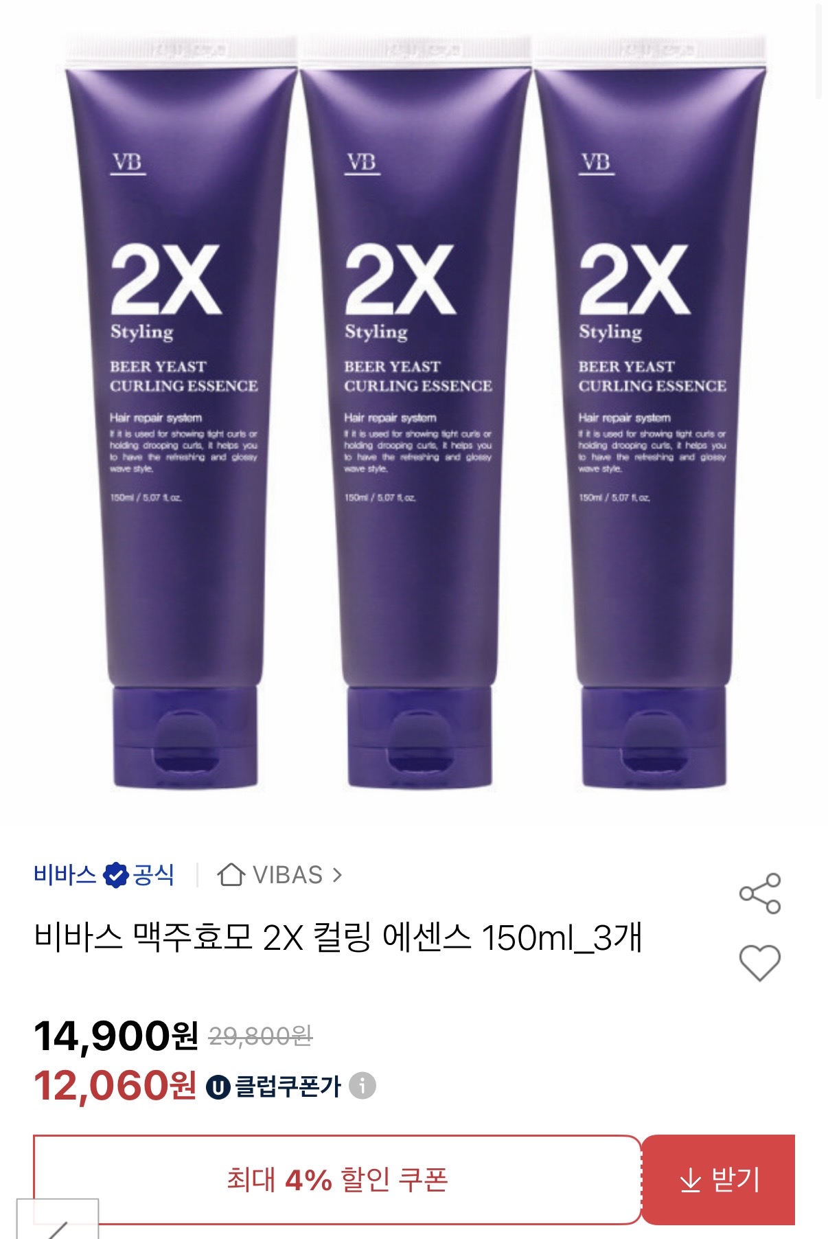 [옥션] 비바스 대용량 헤어컬링에센스 3개 (유클 12,060원/무배)