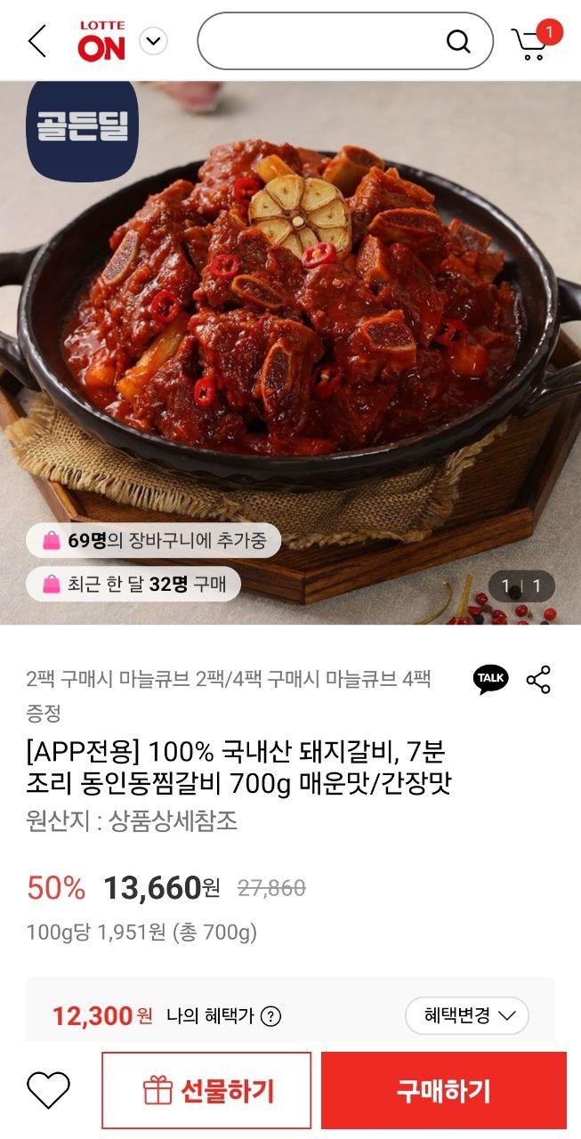 [롯데온] 100% 국내산 돼지갈비 동인동찜갈비 700g 매운맛/간장맛 (12,300원/무배) > 국내핫딜