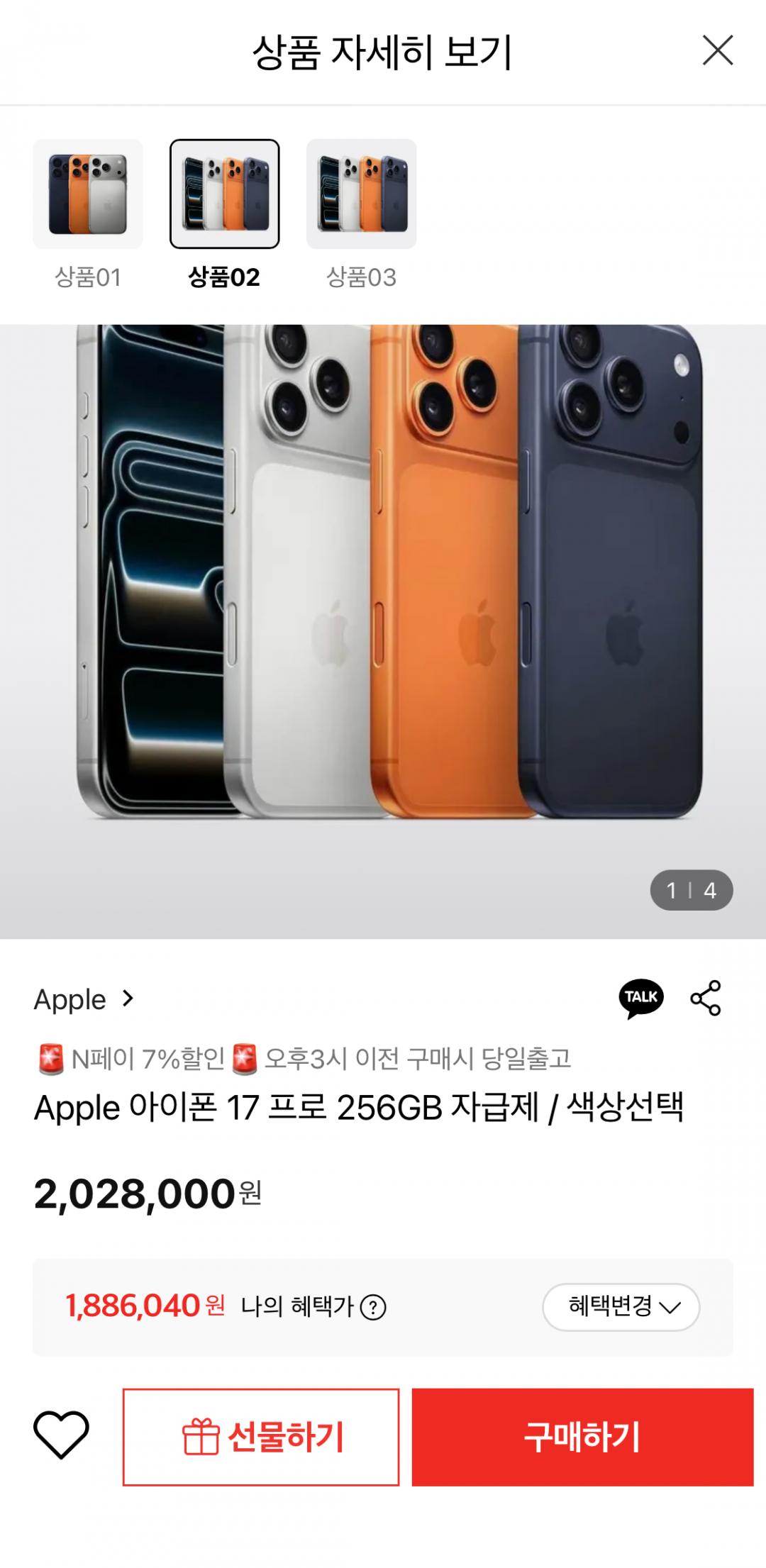 [롯데온] Apple 아이폰 17 프로 256GB 자급제 (1,886,040원/무료)