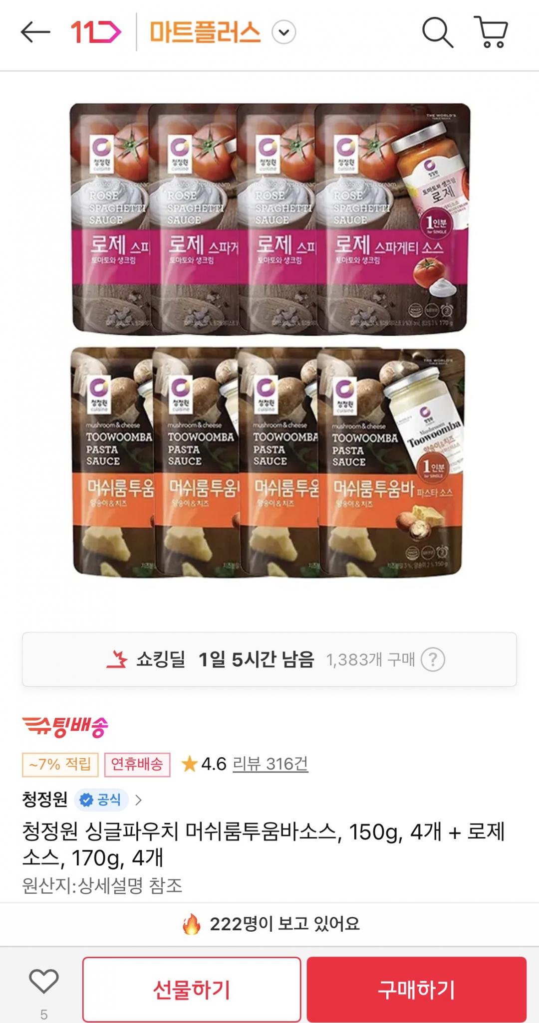 [11번가] 청정원 싱글파우치 머쉬룸투움바소스 4개 + 로제소스 4개 (15,900원/무료) > 국내핫딜