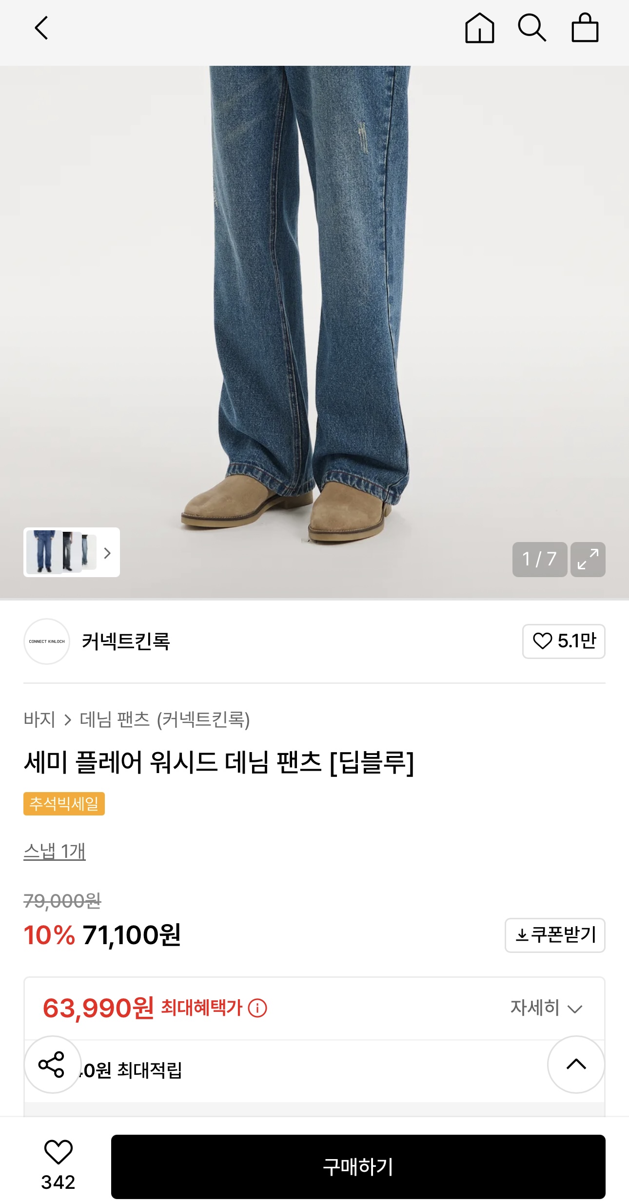 [무신사] 세미 플레어 워시드 데님 팬츠 (63,990원/무료)