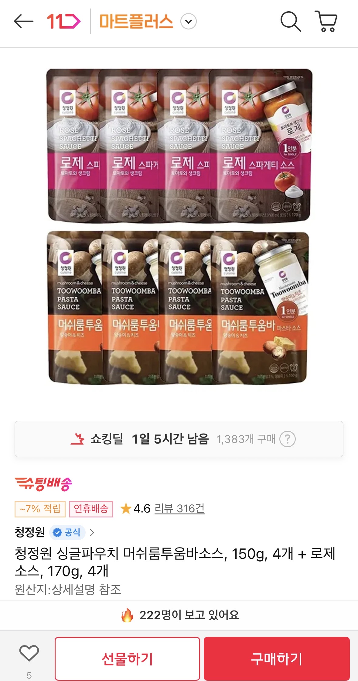 [11번가] 청정원 싱글파우치 머쉬룸투움바소스 4개 + 로제소스 4개 (15,900원/무료)