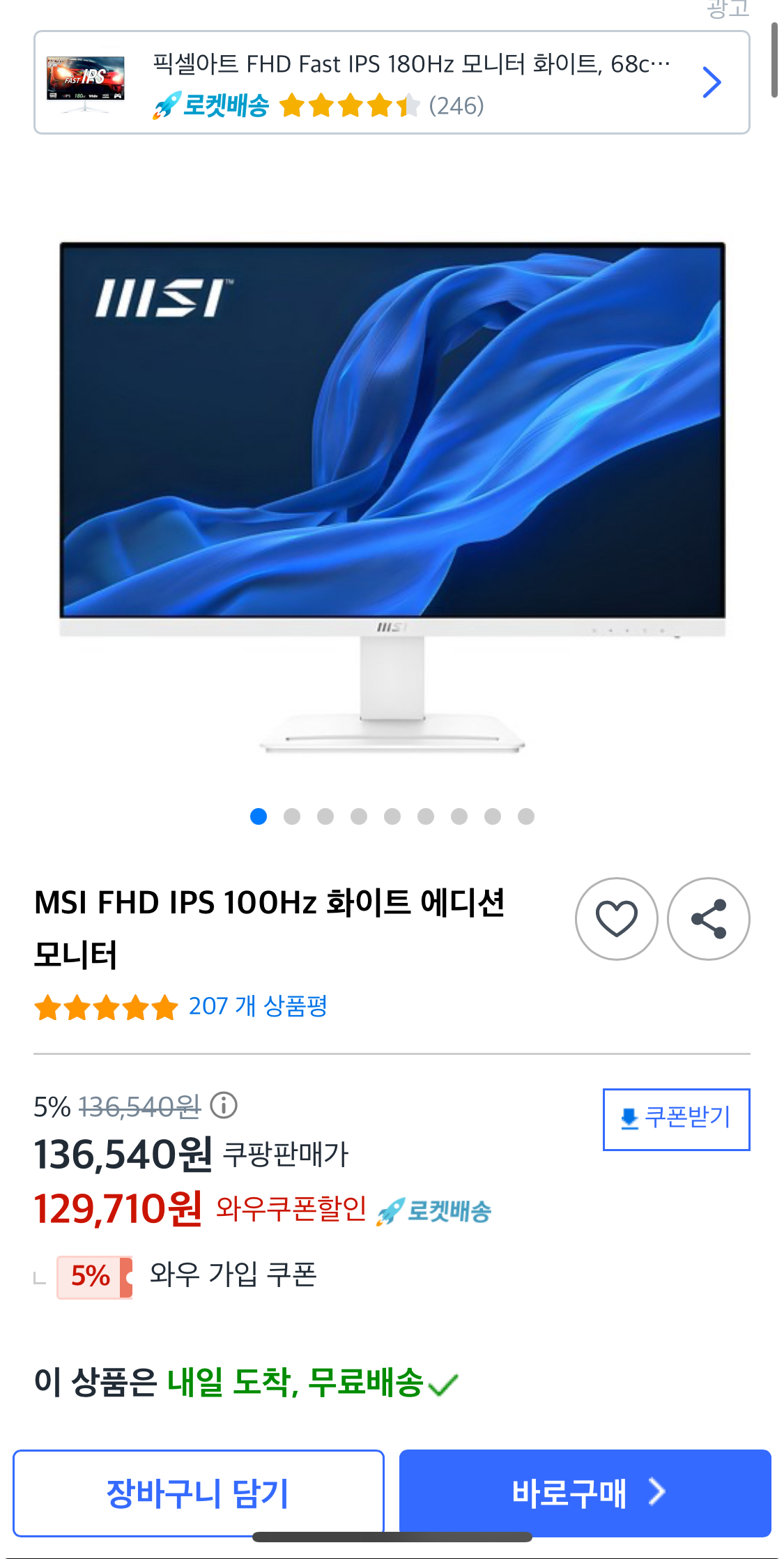 [쿠팡] MSI MP273AW IPS 100 아이에르고 화이트 무결점 (136,540원/무배)