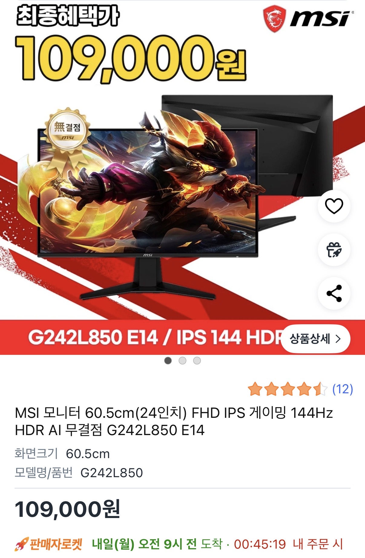 [쿠팡] MSI G242L850 E14 IPS 게이밍 144 HDR AI 무결점 (109,000원/무배)