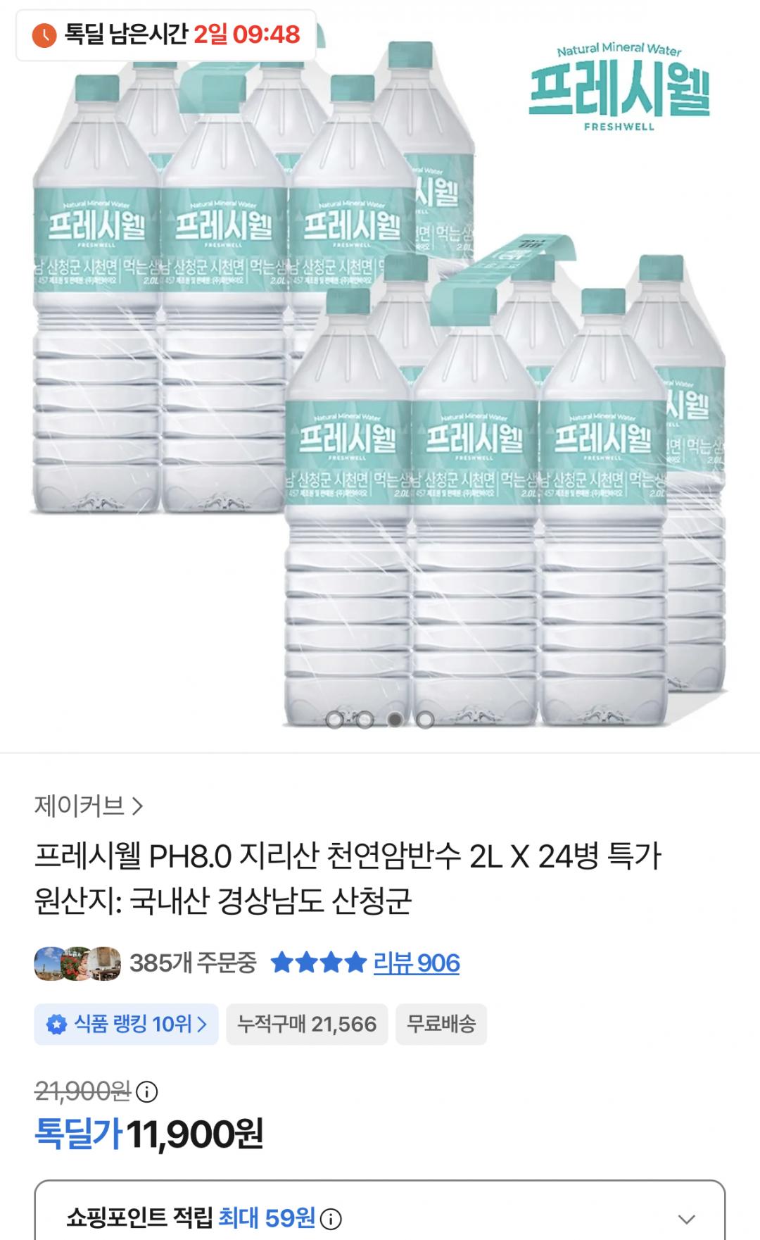 [톡딜] 프레시웰 PH8.0 지리산 천연암반수 2L×24병 (11,900원/무료)
