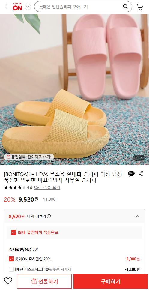 [롯데온] 1+1 층간소음 실내화 사무실 슬리퍼 (8,520/무료)