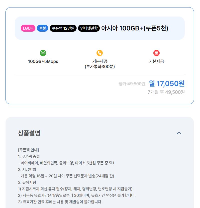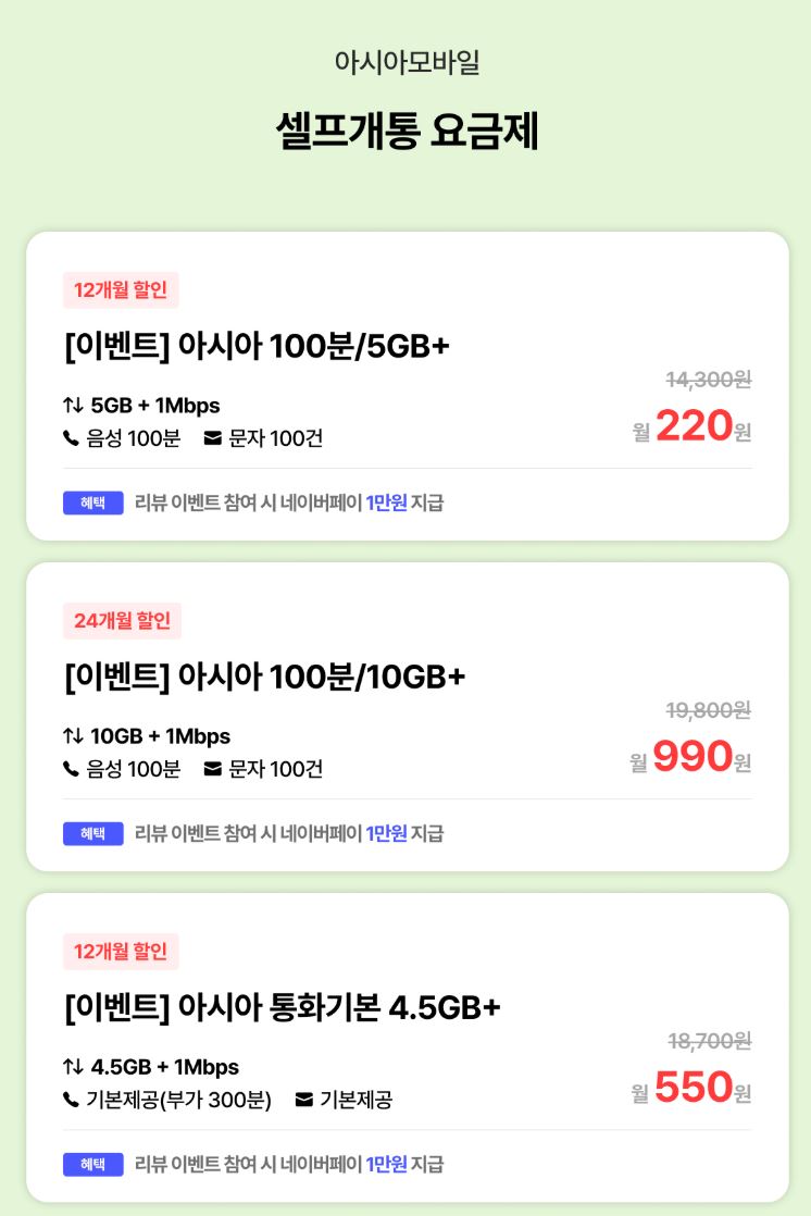 [아시아모바일] 알뜰폰 데이터무제한 체감가 0원 / 24개월간 네이버페이 5천원 지급 (체감가 0원 / 배송비 무료)