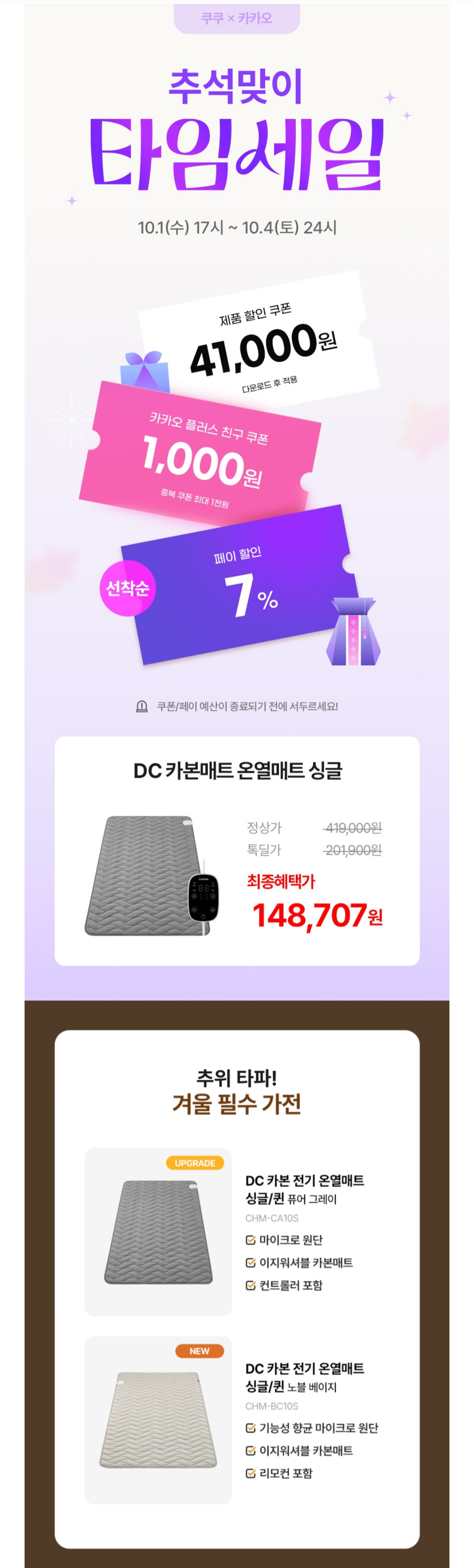 [카카오] 쿠쿠 DC 카본매트 온열매트 (148,707원/무료)