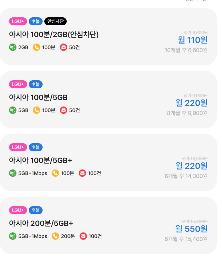 2. 아시아 11GB+(쿠폰 5천) : https://asiamobile.kr/view/price/pricePlan_detail.aspx?gdcd=LPZ1006032