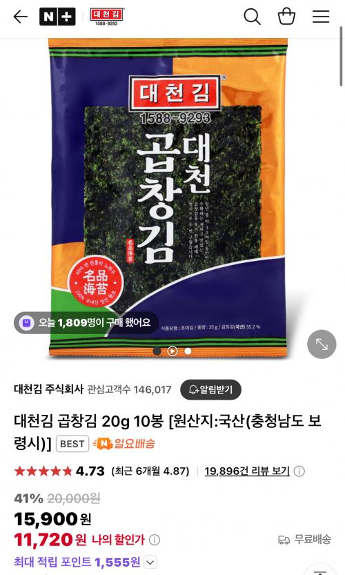 [네이버] 대천김 곱창김 20g 10봉(11,720원/무배) > 국내핫딜