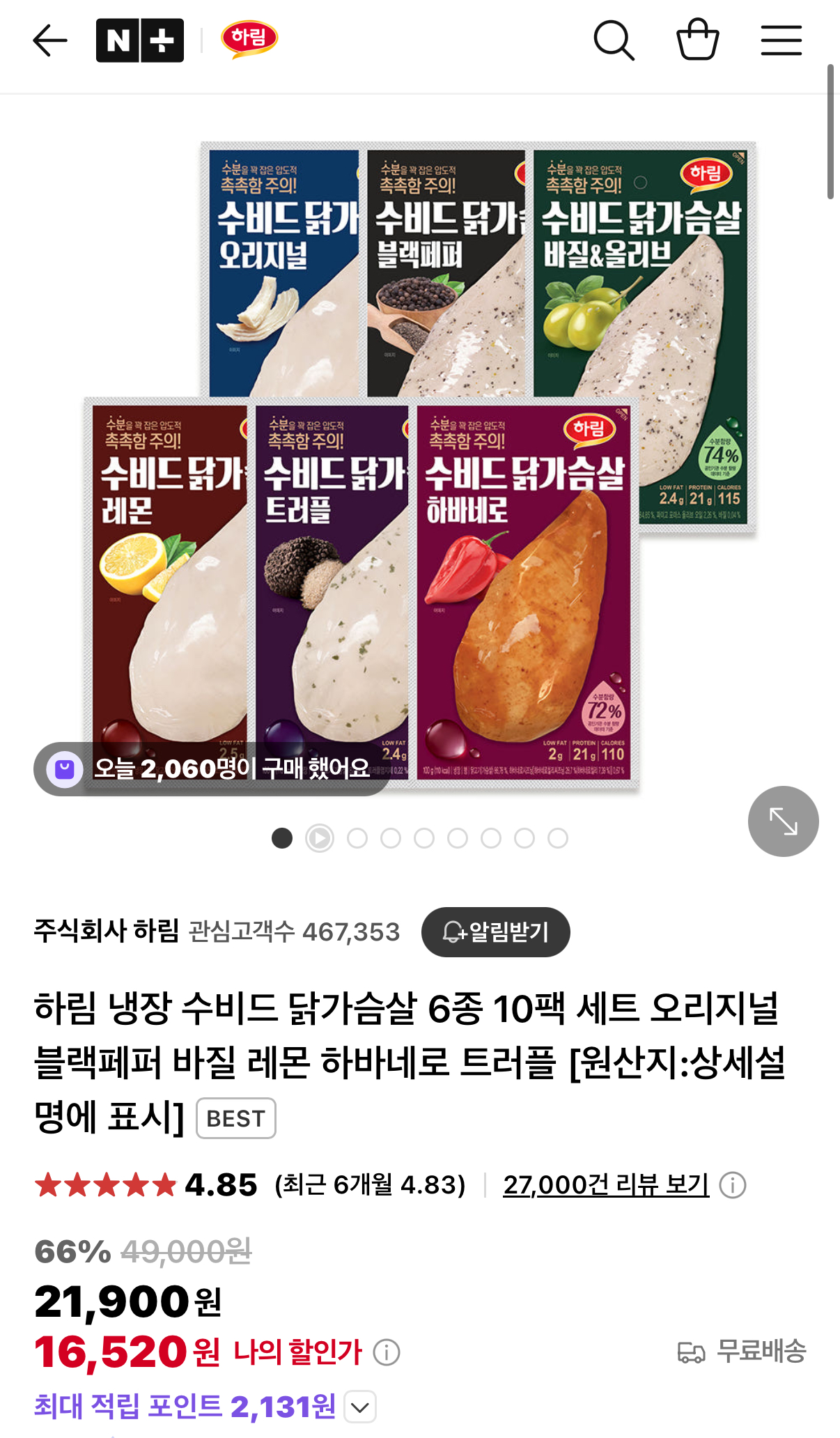 [네이버] 하림 냉장 수비드 닭가슴살 6종 10팩 세트(16,520원/무배)